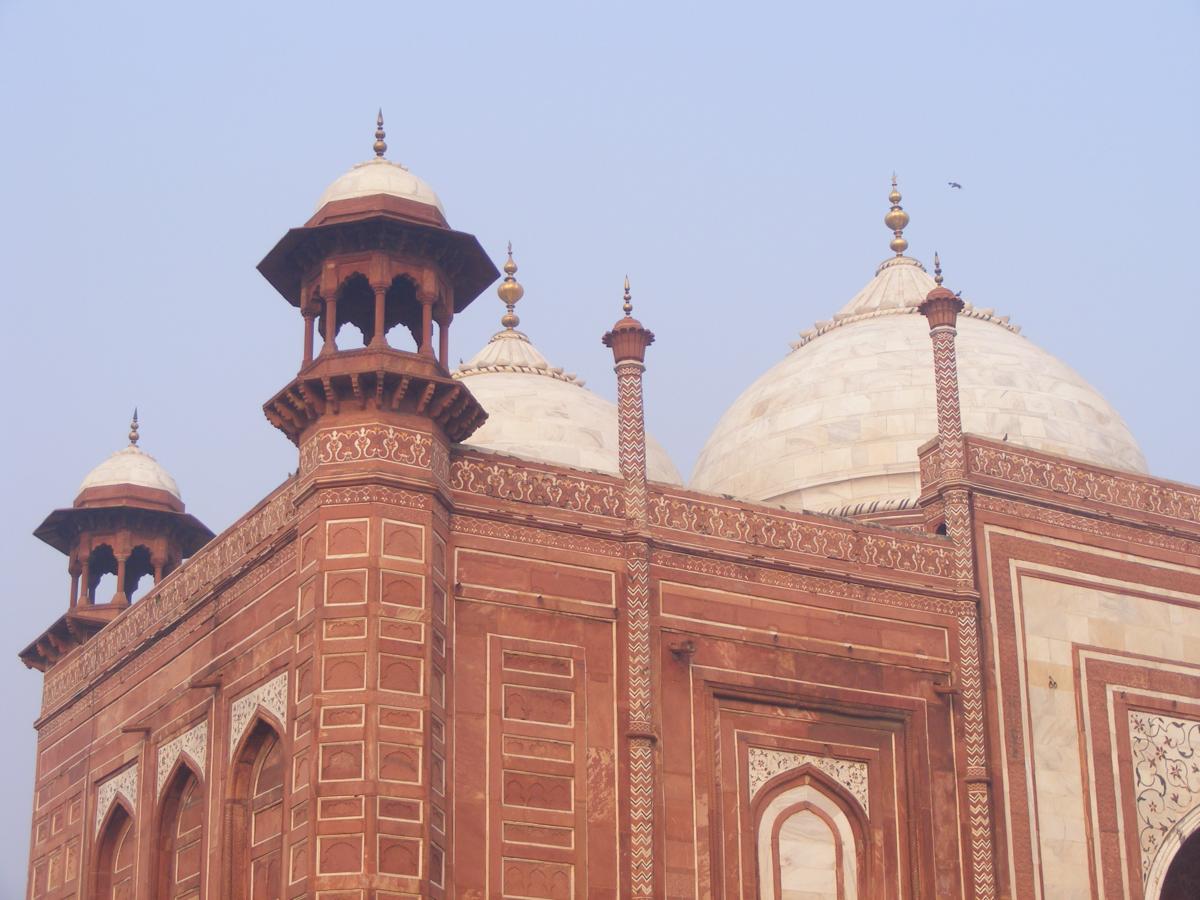 Ne apropiem pentru a admira intrarea monumentala la mormintele celor doi soti. Si aici, versetele din Coran si intarsiile din 35 de tipuri de pietre pretioase si semipretioase impodobesc peretii. In timp, mare parte au fost jefuite, mai ales atunci cand monumentul s-a aflat in stare de neglijare. In interiorul mausoleului nu este permisa fotografierea. Cele 99 de nume ale lui Alah sunt scrise pe mormantul lui Mumtaz. In cripta, interior si exterior si cenotafurile sunt impodobite cu motive florale de mare finete.In partea stanga a mausoleului se inalta o moschee din gresie rosie. Intre ele, un bazin in care se oglindeste mausoleul.
